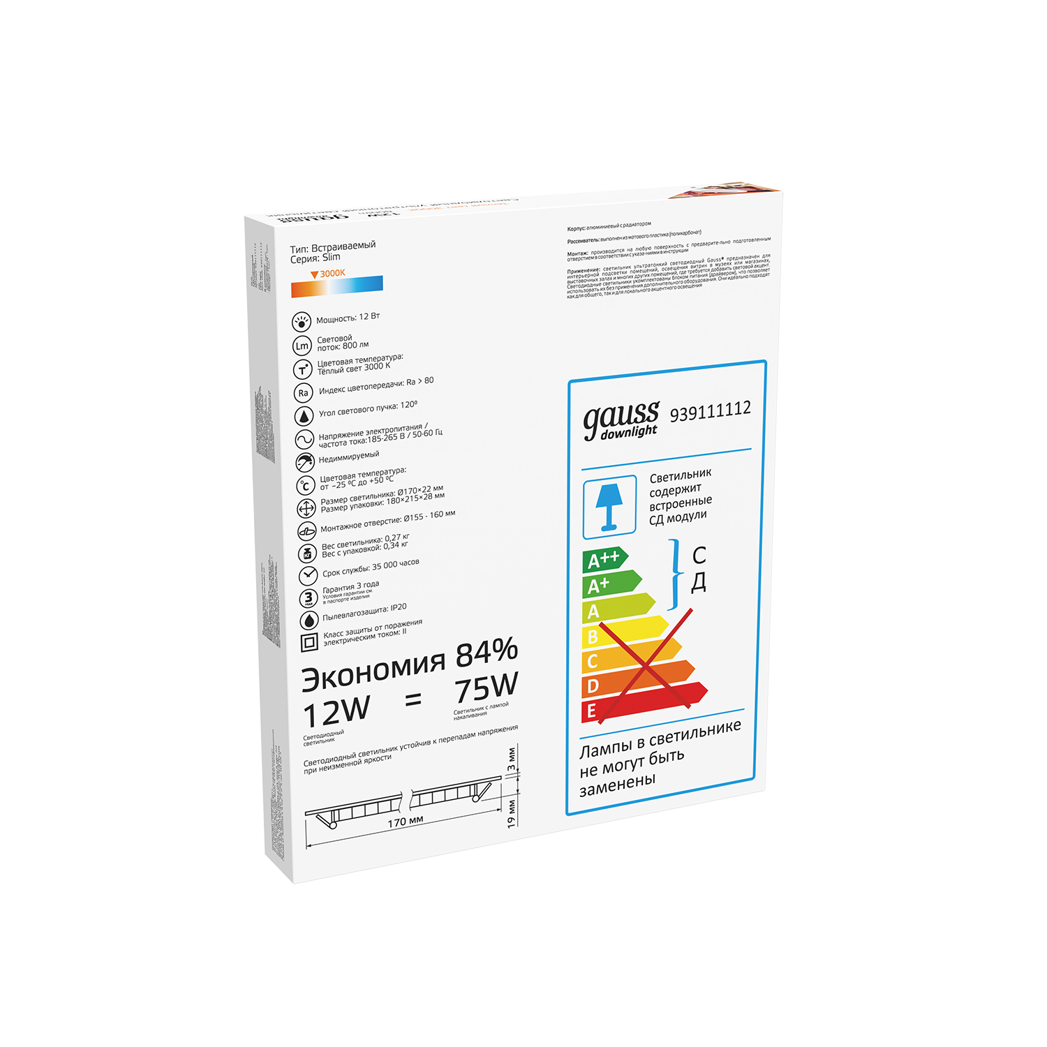 Светильник Gauss Slim круг 12W 990lm 6500K 180-265V LED 939111312