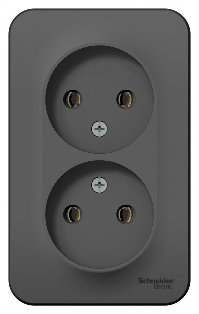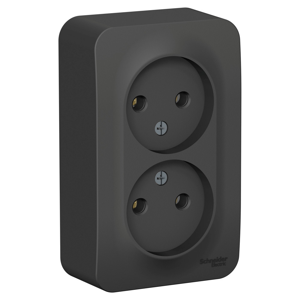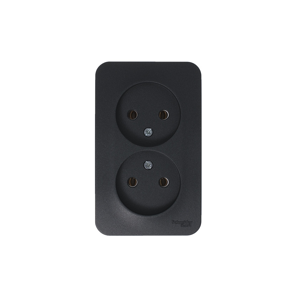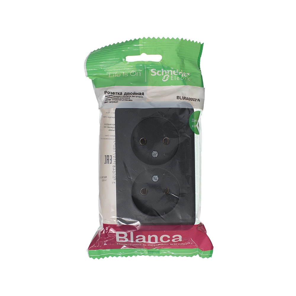 Розетка Schneider Electric BLANCA (антрацит, открытой установки) двухместная, без шторок и заземления, с изолирующей пластиной предназначена для сетей до 250В, на ток до 16А. Двухместная розетка позволяет подключить два устройства в одном месте. Она изготовлена из ABS-пластика, проста в установке и удобна в применении