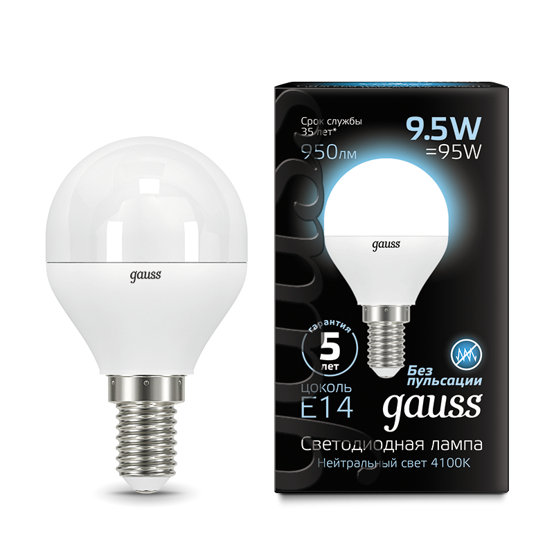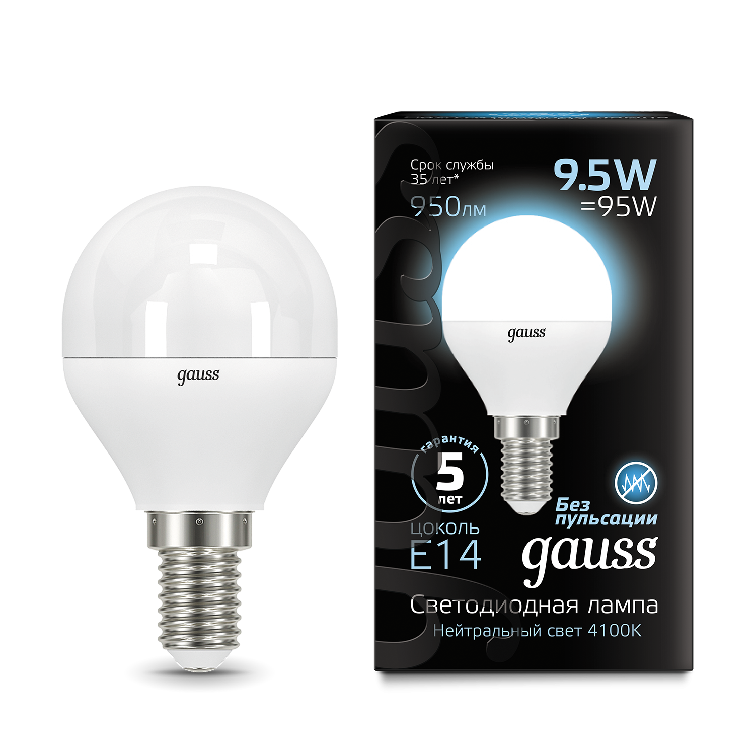 Лампа Gauss Шар 9.5W 950lm 4100K E14 LED 105101210 (5 шт)