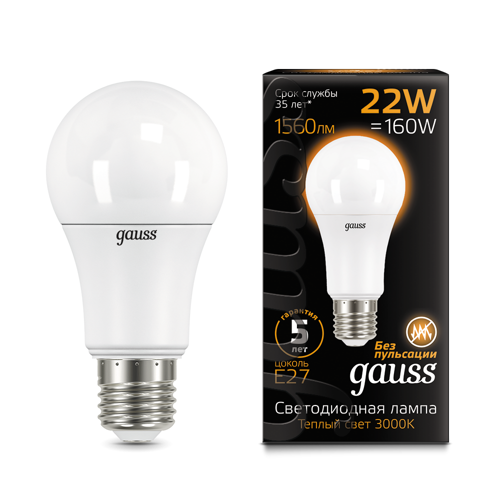 Лампа Gauss A70 22W 1900lm 3000K E27 LED 102502122 (5 шт)