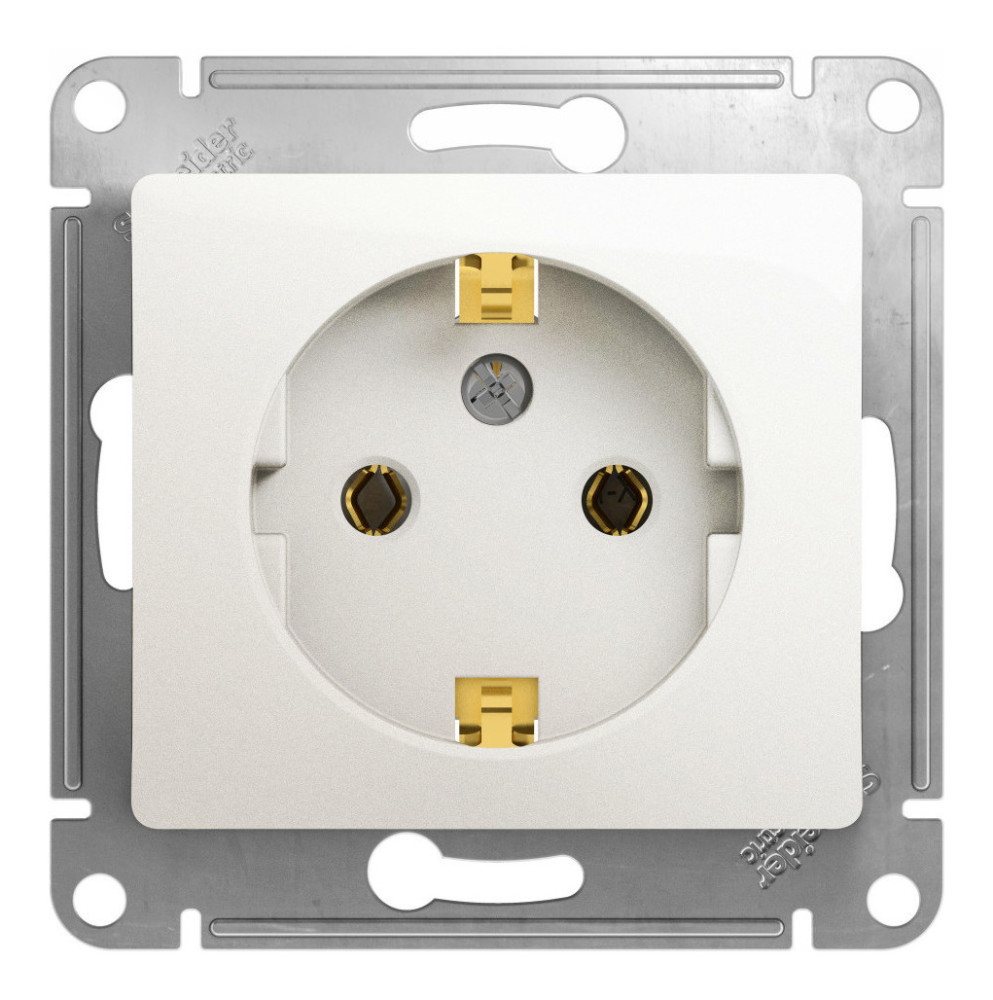 Механизм Schneider Electric Glossa (цвет перламутр) розетки одинарной с заземлением и без шторок подходит для сетей 250 В, на ток 16 А.- Заземляющий контакт обеспечивает дополнительную защиту от удара электрическим током. При наличии заземления электрический потенциал уходит в землю, защищая человека.- Выполнен из материала PС+ASA, стойкого к УФ-излучению и появлению царапин.- Эргономичные клеммы розеток расположены в один ряд