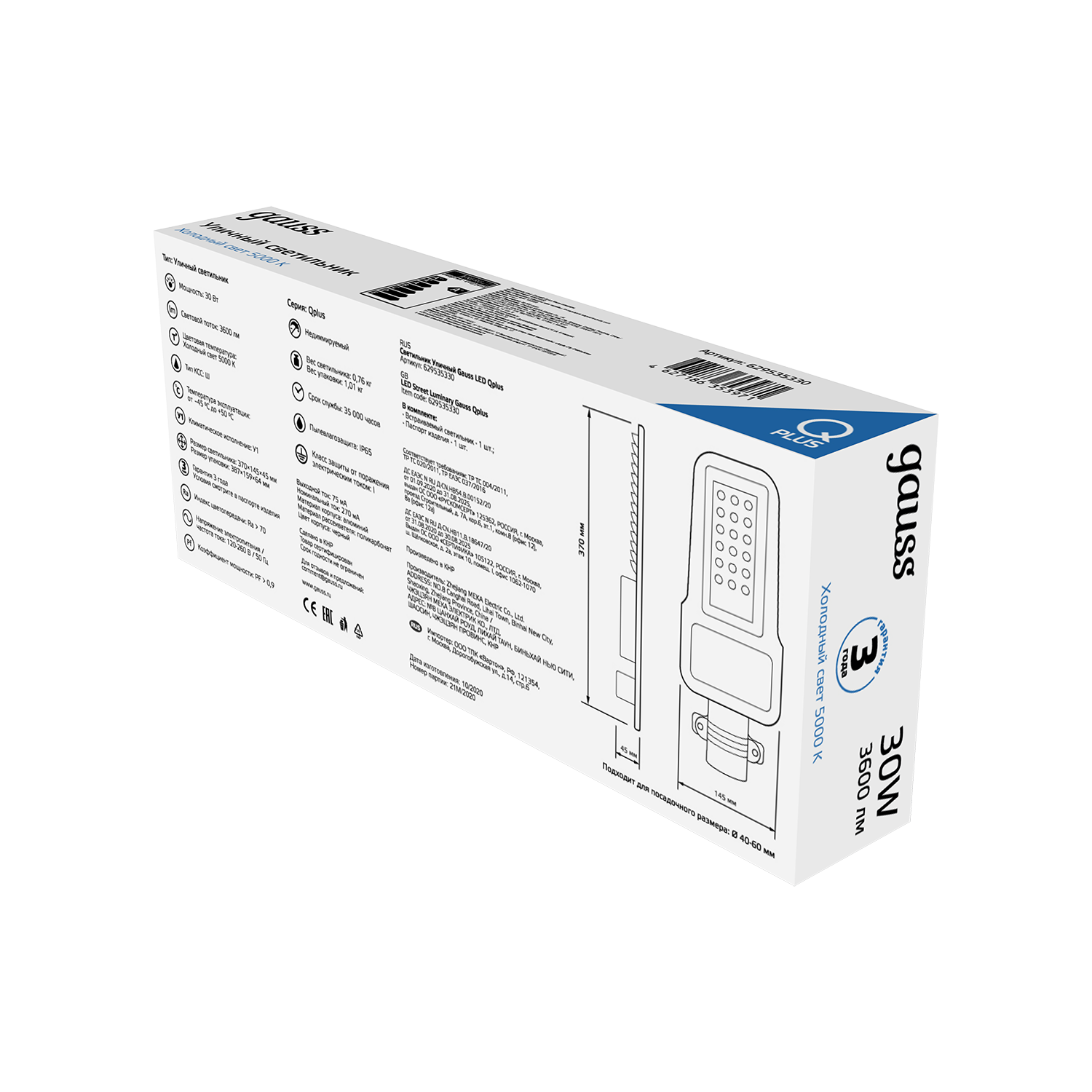 Прожектор Gauss Qplus 400W 48000lm 6500K 100-240V IP65 LED 613511400