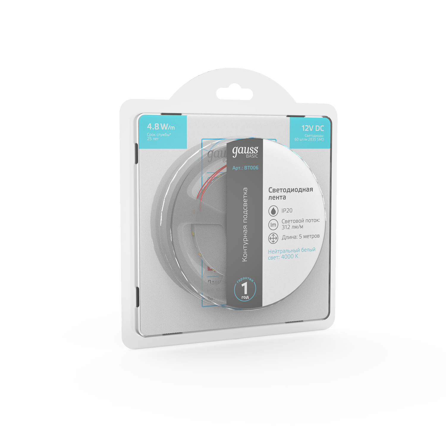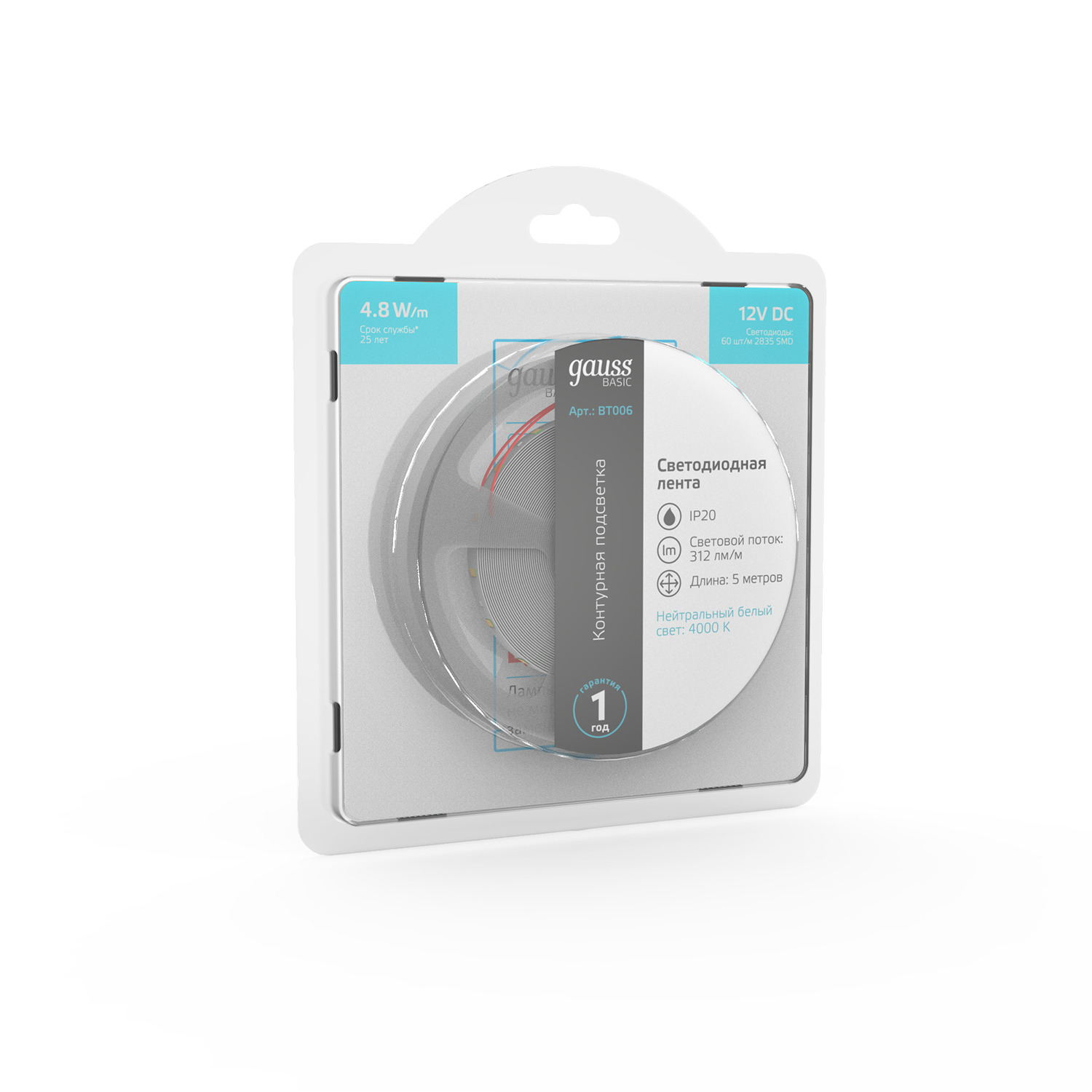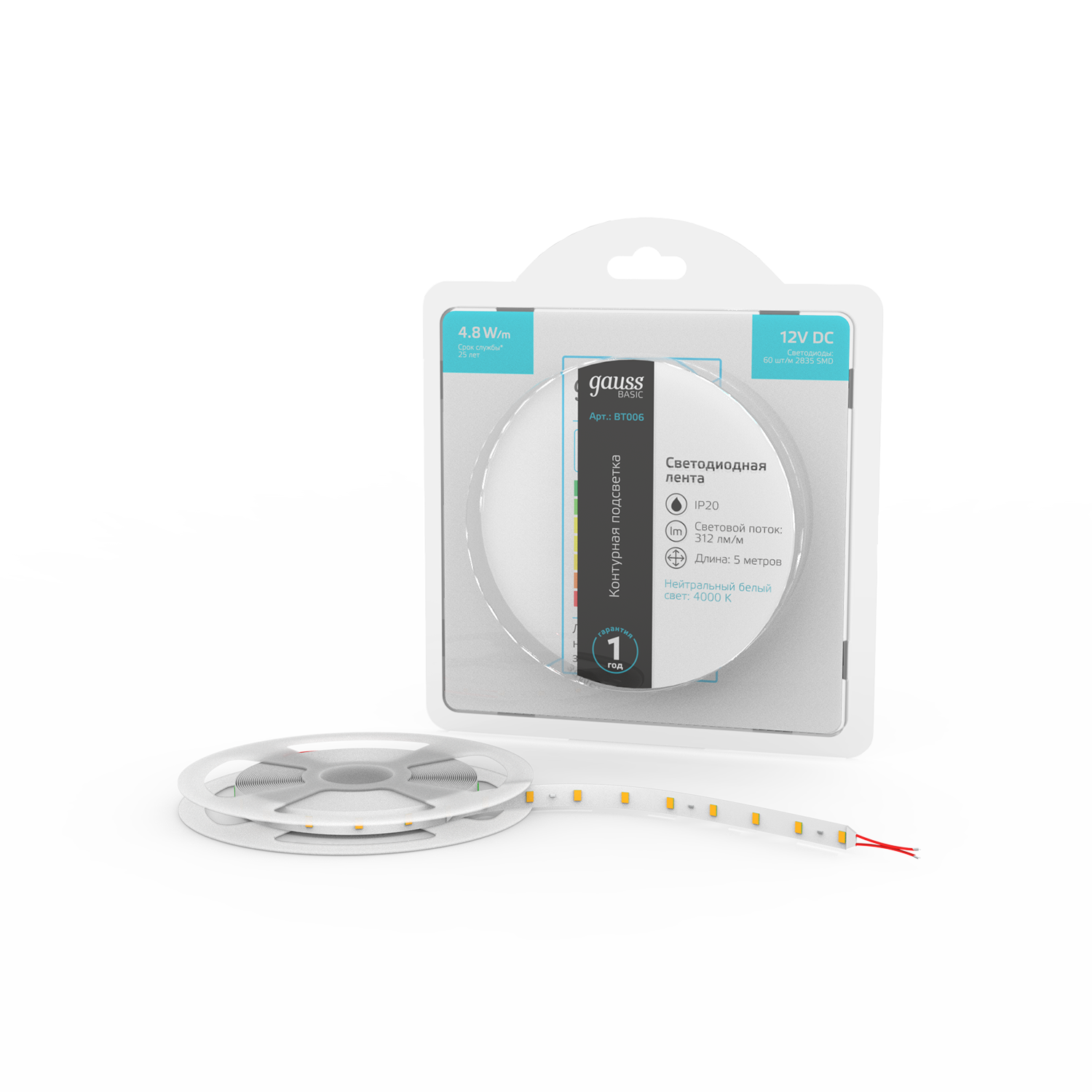 Лента Gauss Basic LED 2835/60 12V 4,8W/m 312lm/m 4000K 8mm IP20 5м 1/100 BT006