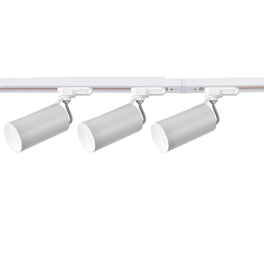каркас белого цвета, в комплект трековой системы входят: 3 спота, шинопровод (2х1м) и коннектор, угол поворота до 75°, лампу GU10 можно менять