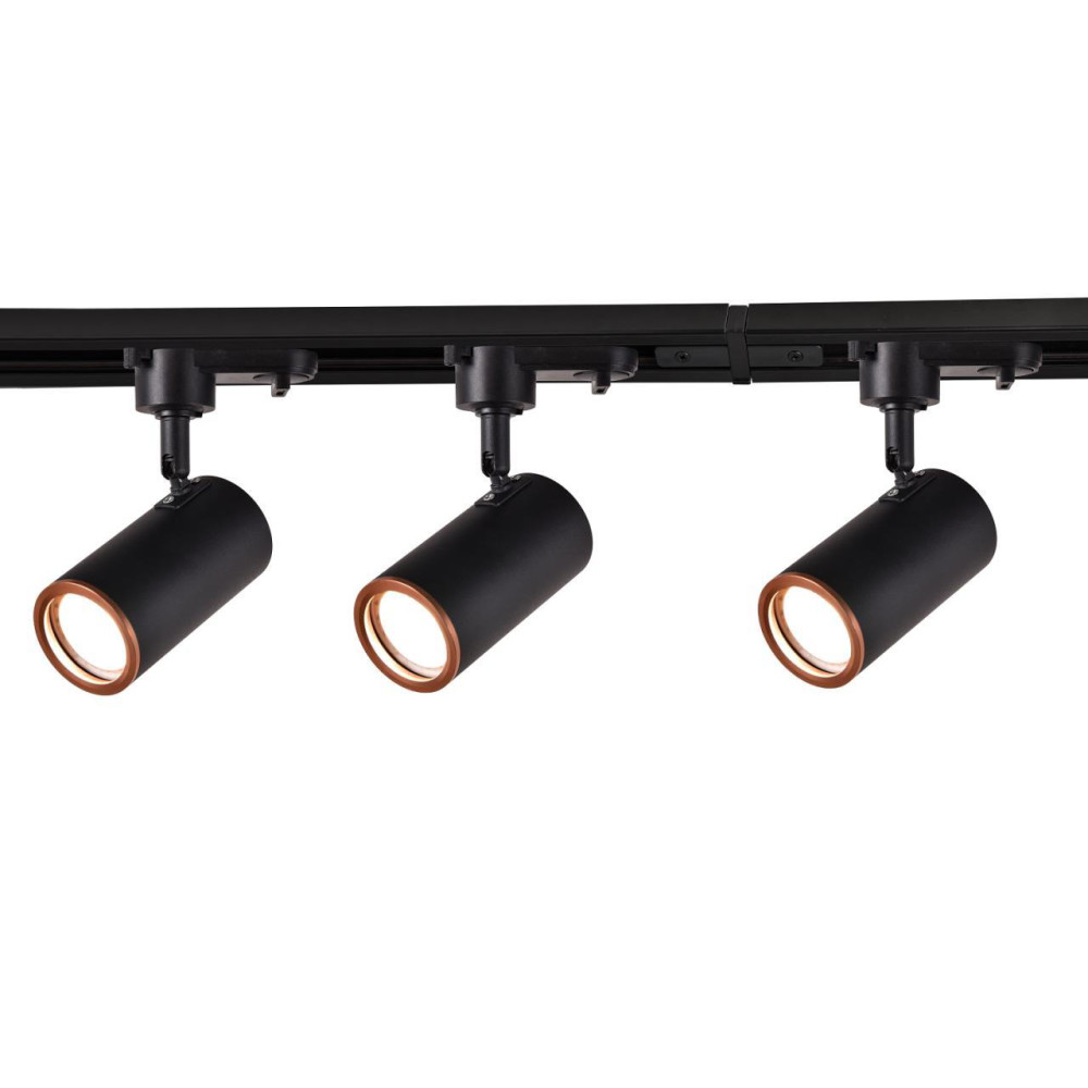 каркас светильника сочетает два цвета - черный и золото, в комплект трековой системы входят: 3 спота, шинопровод (2х1м) и коннектор, угол поворота до