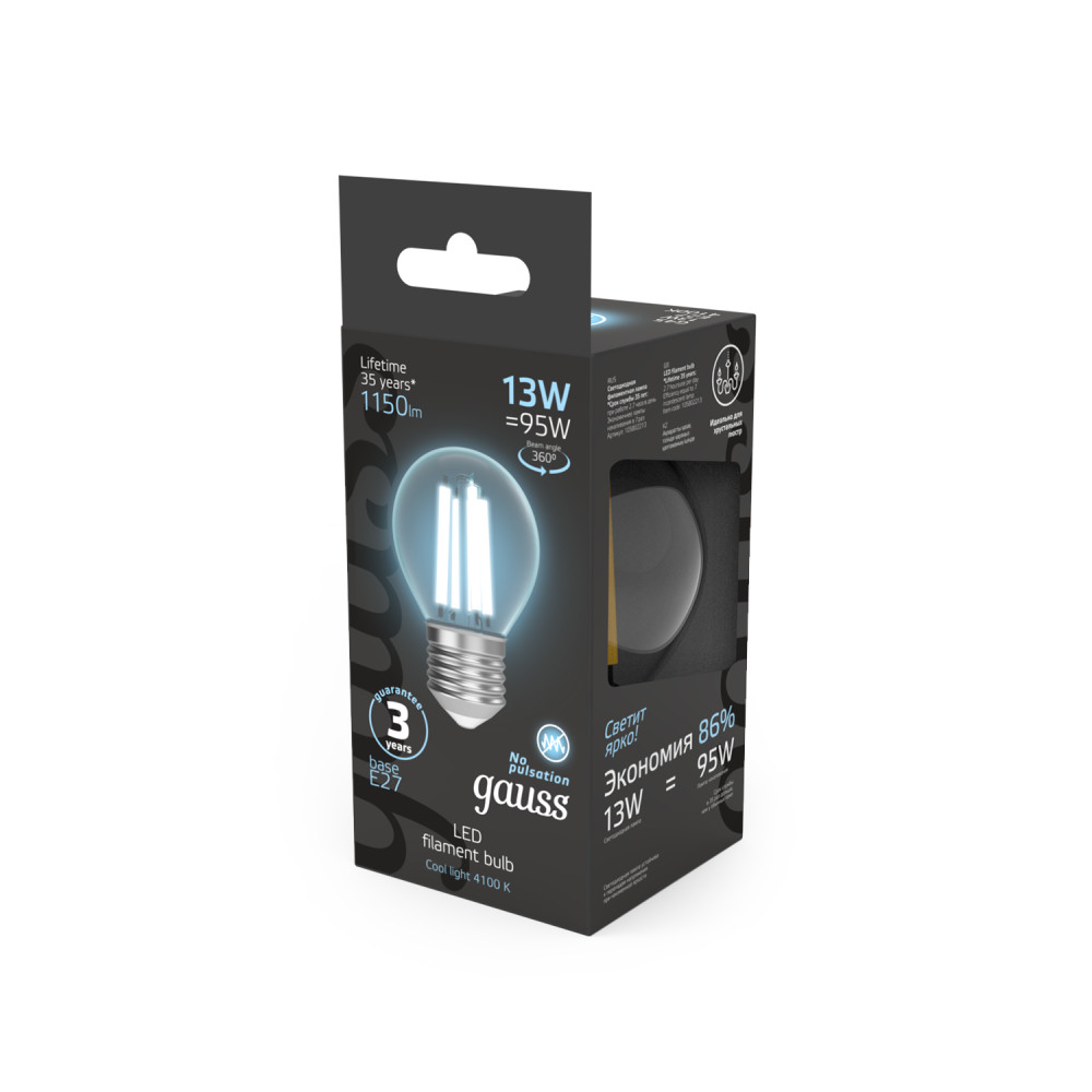 Лампа Gauss Filament Шар 13W 1150lm 4100К Е27 LED 1/10/50 105802213