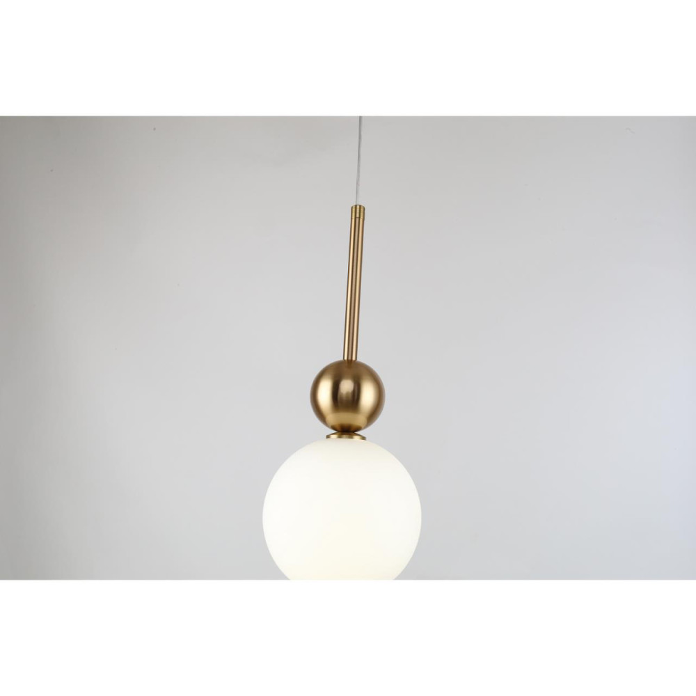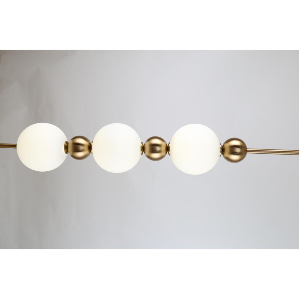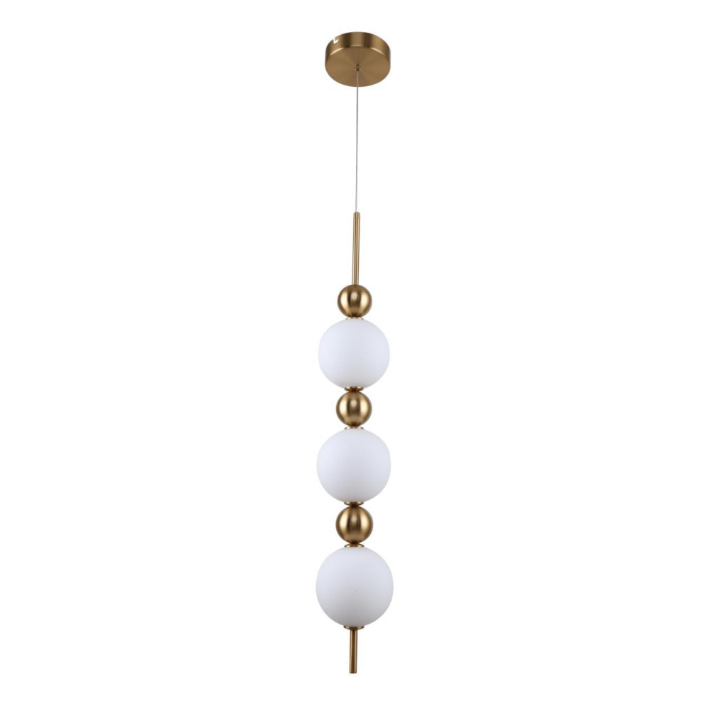Сочетание плафонов из белого стекла с декоративными шарами и каркасом цвета латуни. Источник света – LED