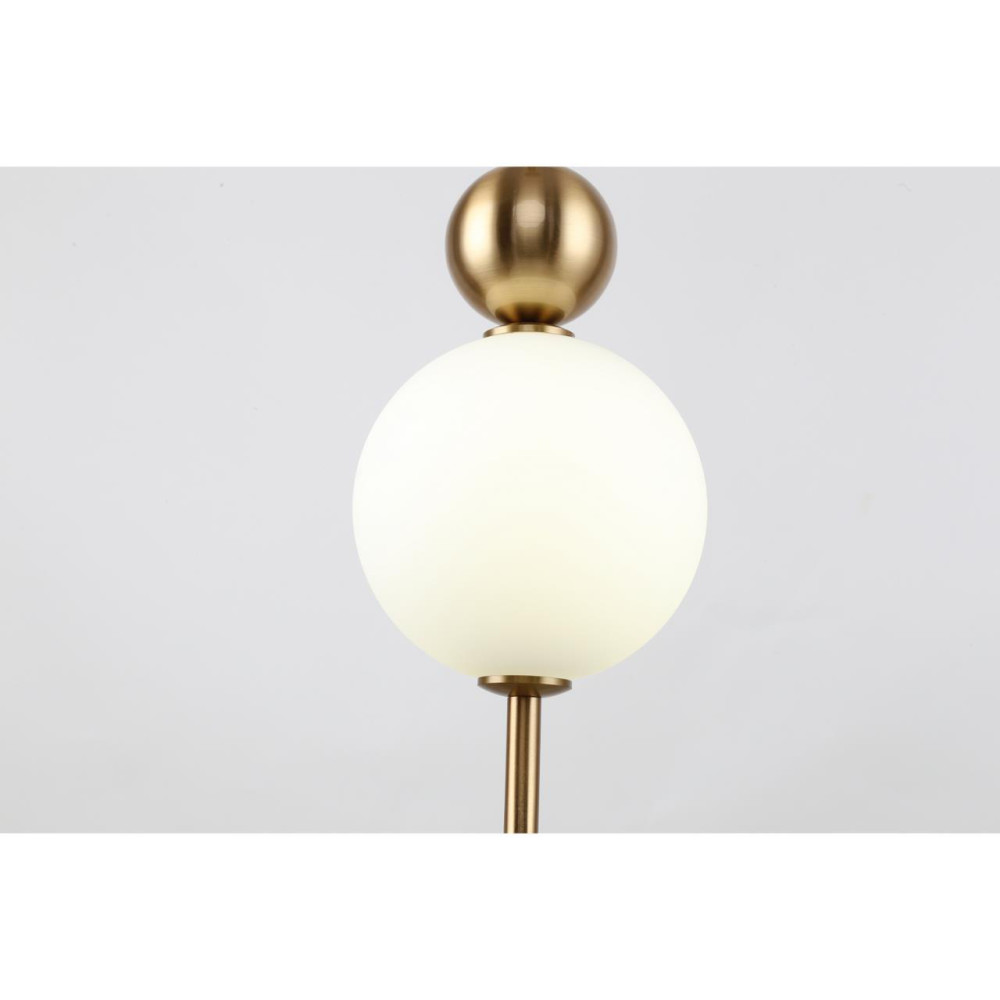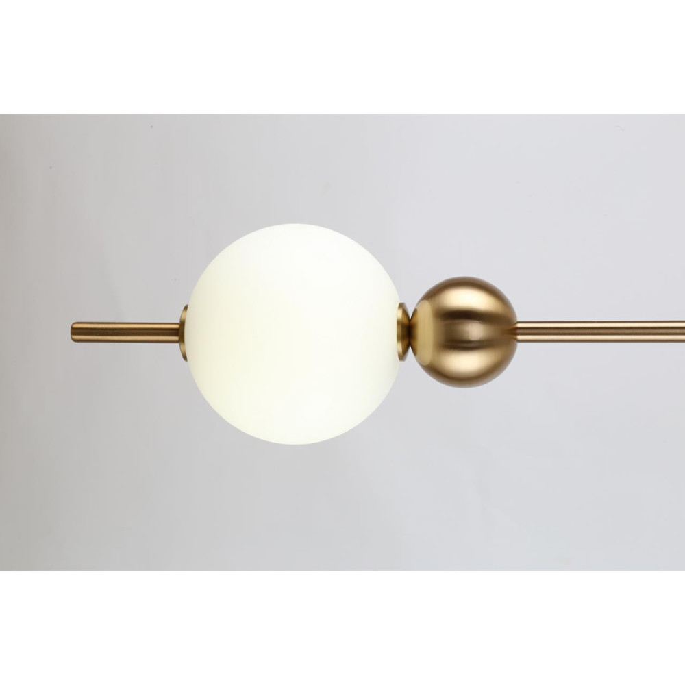 Сочетание плафонов из белого стекла с декоративными шарами и каркасом цвета латуни. Источник света – LED