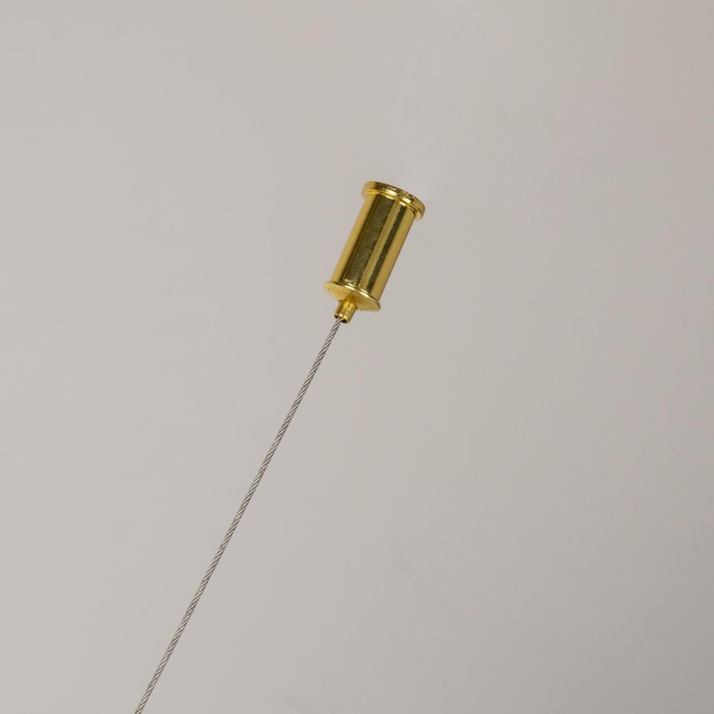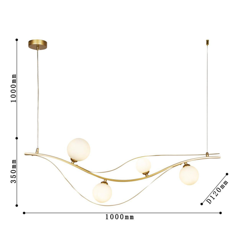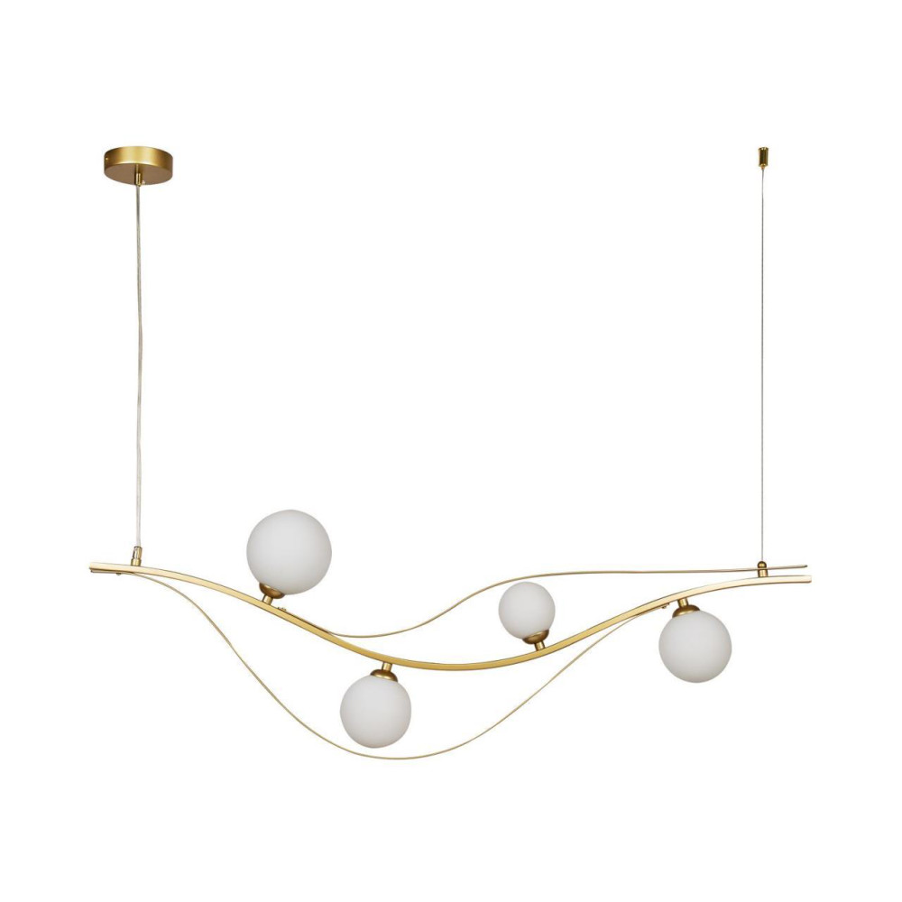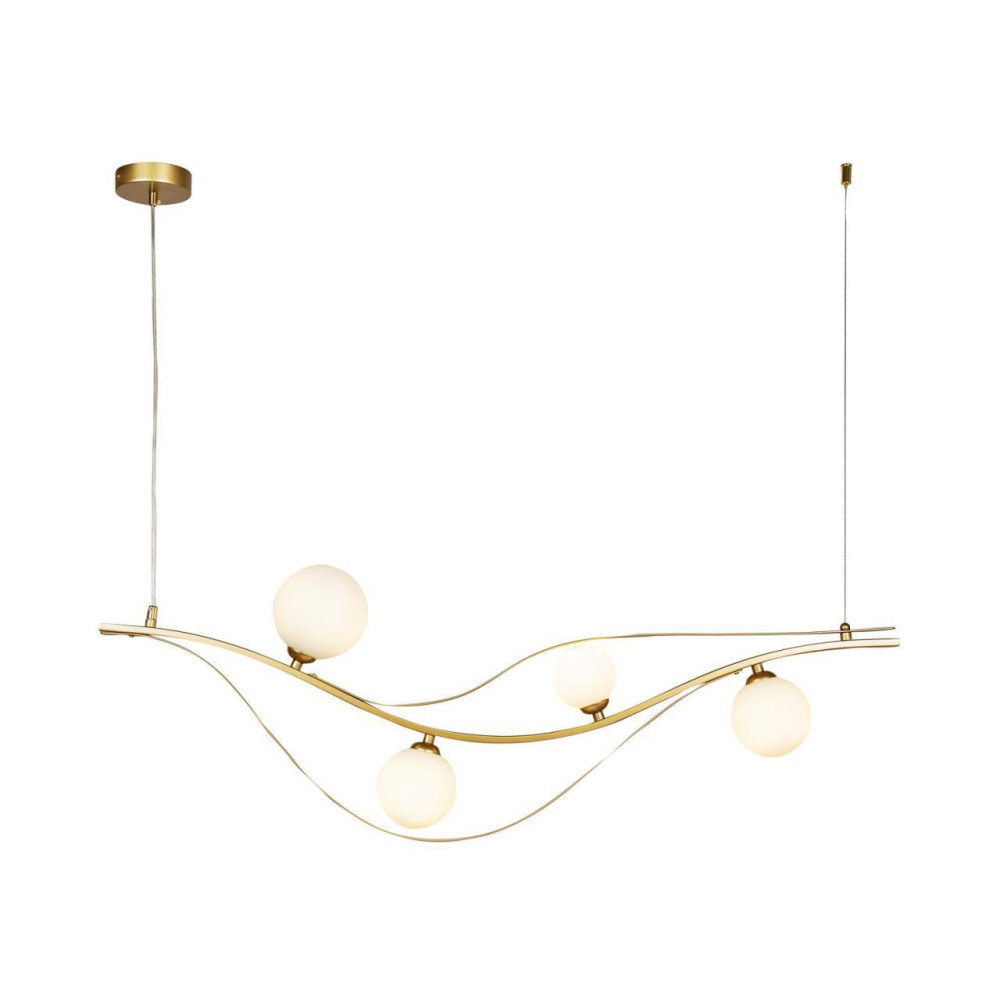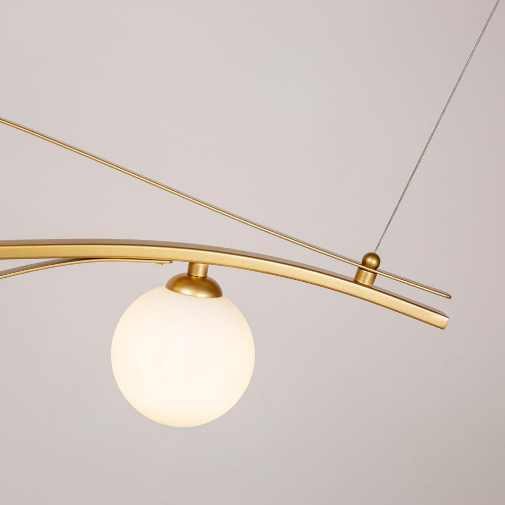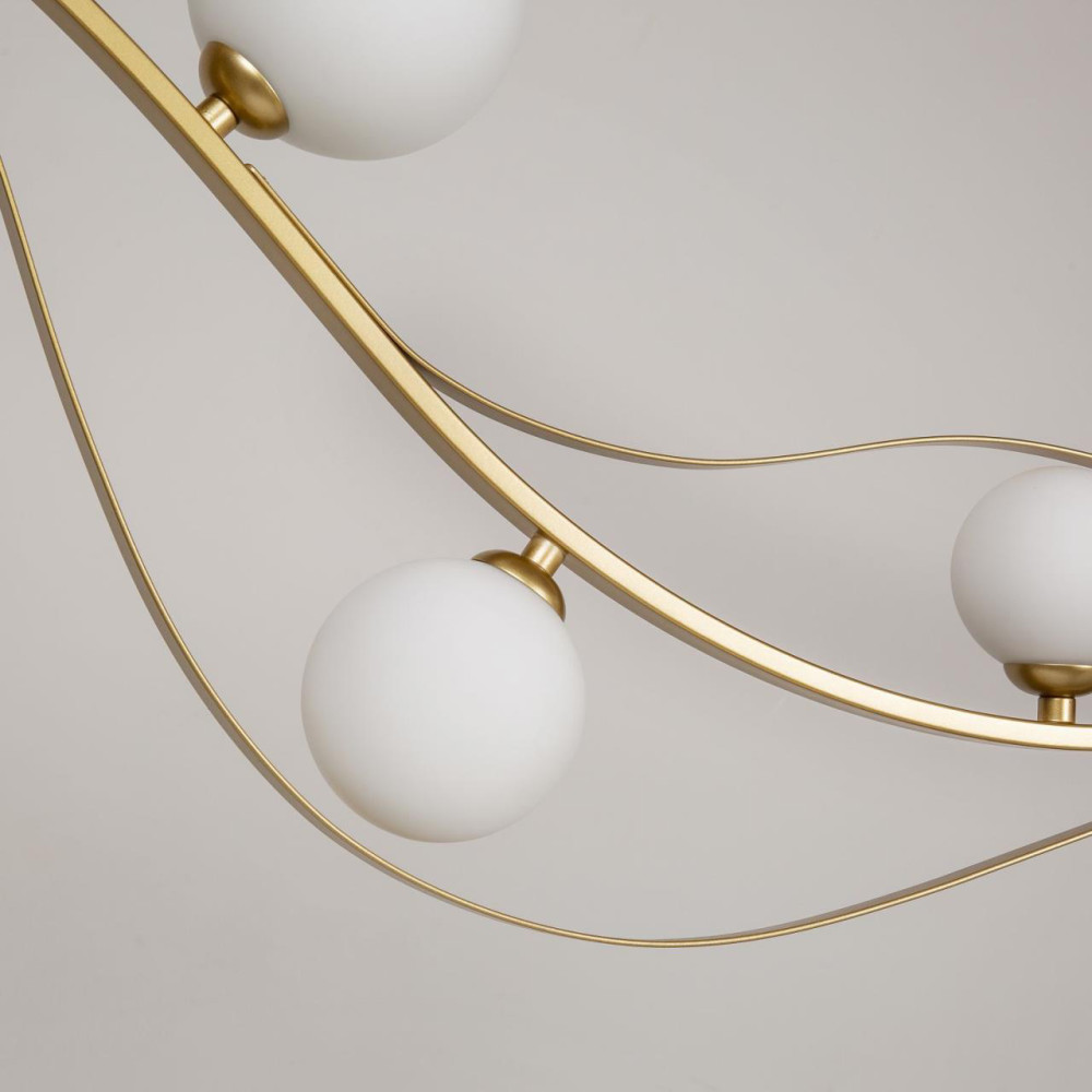 каркас изогнутой формы цвета золота, плафоны из выдувного стекла белого цвета, часть каркаса фиксируется тросиком для баланса