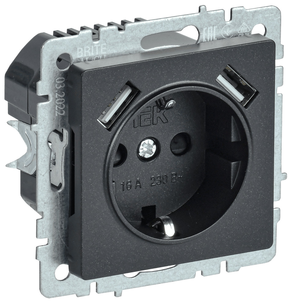 Розетка с заземлением и защитными шторками USB IEK Brite A+A 3,1А РЮш10-2-БрЧ черный BR-R14-16-U21-D31-K02