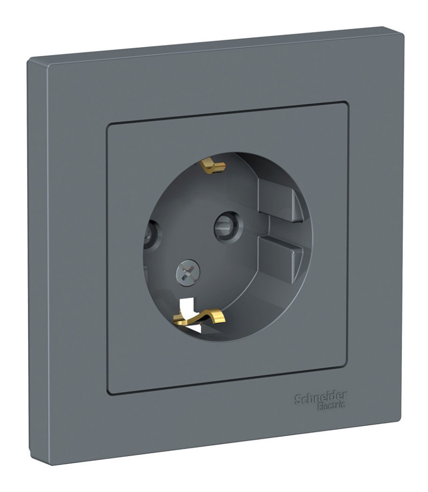 Розетка Schneider Electric AtlasDesign (в сборе, цвет грифель) одинарная с заземлением и без шторок подходит для сетей 250 В, на ток 16 А.- Заземляющий контакт обеспечивает дополнительную защиту от удара электрическим током. При наличии заземления электрический потенциал уходит в землю, защищая человека.- Лицевые детали из качественного ABS-пластика, устойчивого к царапинам и УФ-излучению.- Изделие поставляется в комплекте с рамкой того же цвета