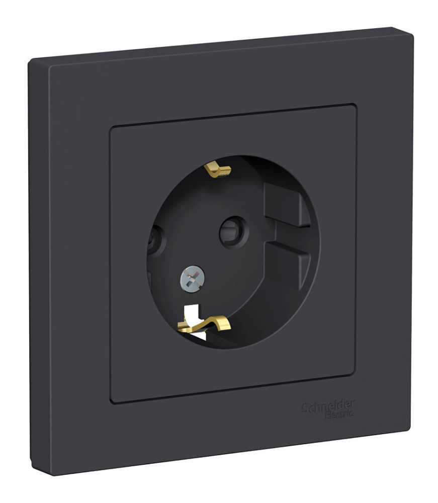 Розетка Schneider Electric AtlasDesign (в сборе, цвет карбон) одинарная с заземлением и без шторок подходит для сетей 250 В, на ток 16 А.- Заземляющий контакт обеспечивает дополнительную защиту от удара электрическим током.- Лицевые детали из качественного ABS-пластика, устойчивого к царапинам и УФ-излучению.- Изделие поставляется в комплекте с рамкой того же цвета.- Благодаря покрытию «soft touch» к изделию приятно прикасаться