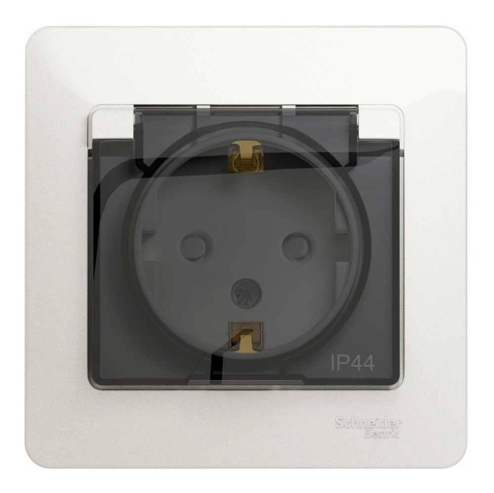 Розетка Schneider Electric Glossa (в сборе, цвет перламутр) одинарная с заземлением, шторками и крышкой подходит для сетей 250 В, на ток 16 А.- Изделие со степенью защиты IP44 обеспечит безопасность использования в ванной и на кухне.- Заземляющий контакт обеспечивает дополнительную защиту от удара электрическим током. При наличии заземления электрический потенциал уходит в землю, защищая человека.- Выполнен из материала PС+ASA, стойкого к УФ-излучению и появлению царапин