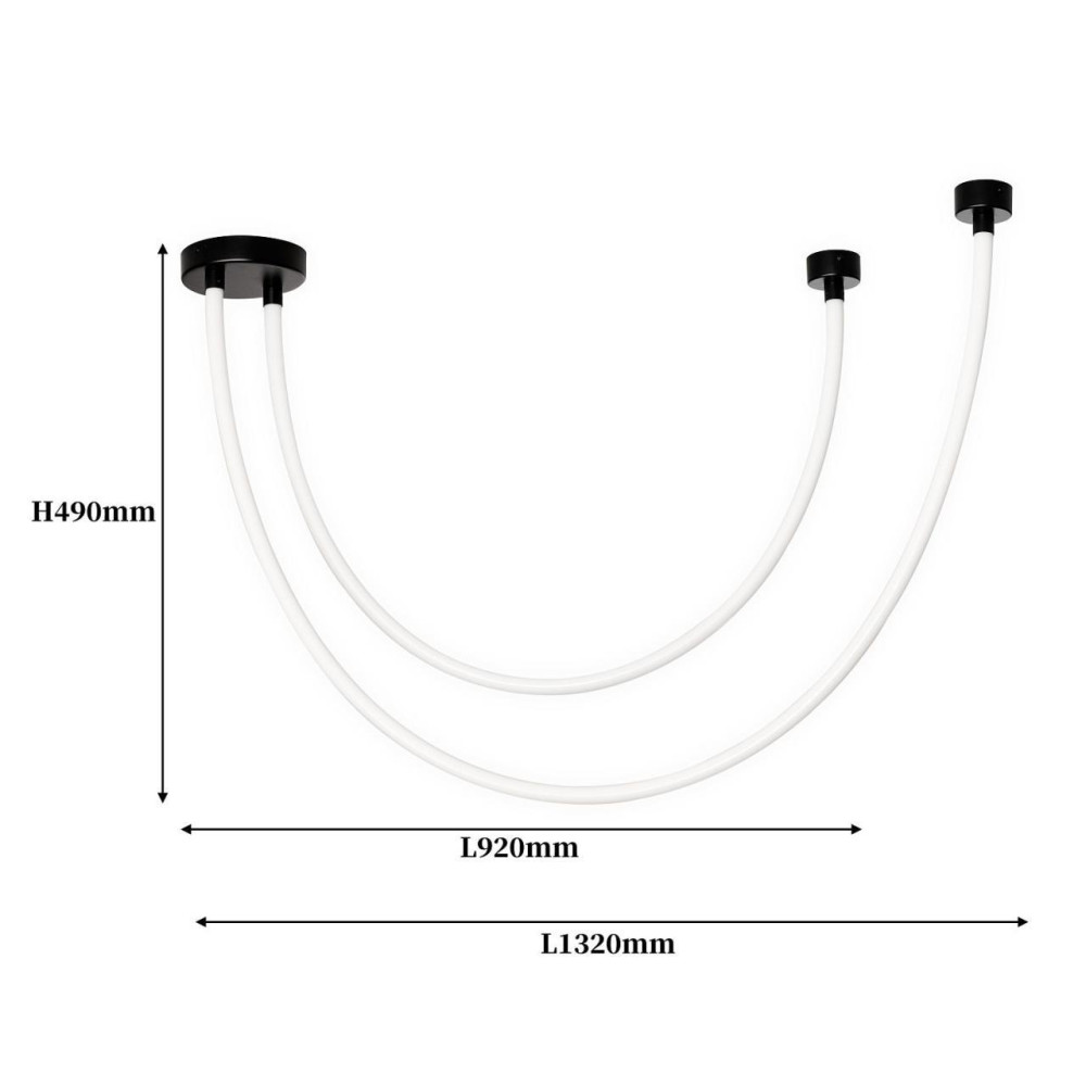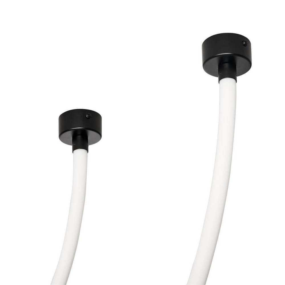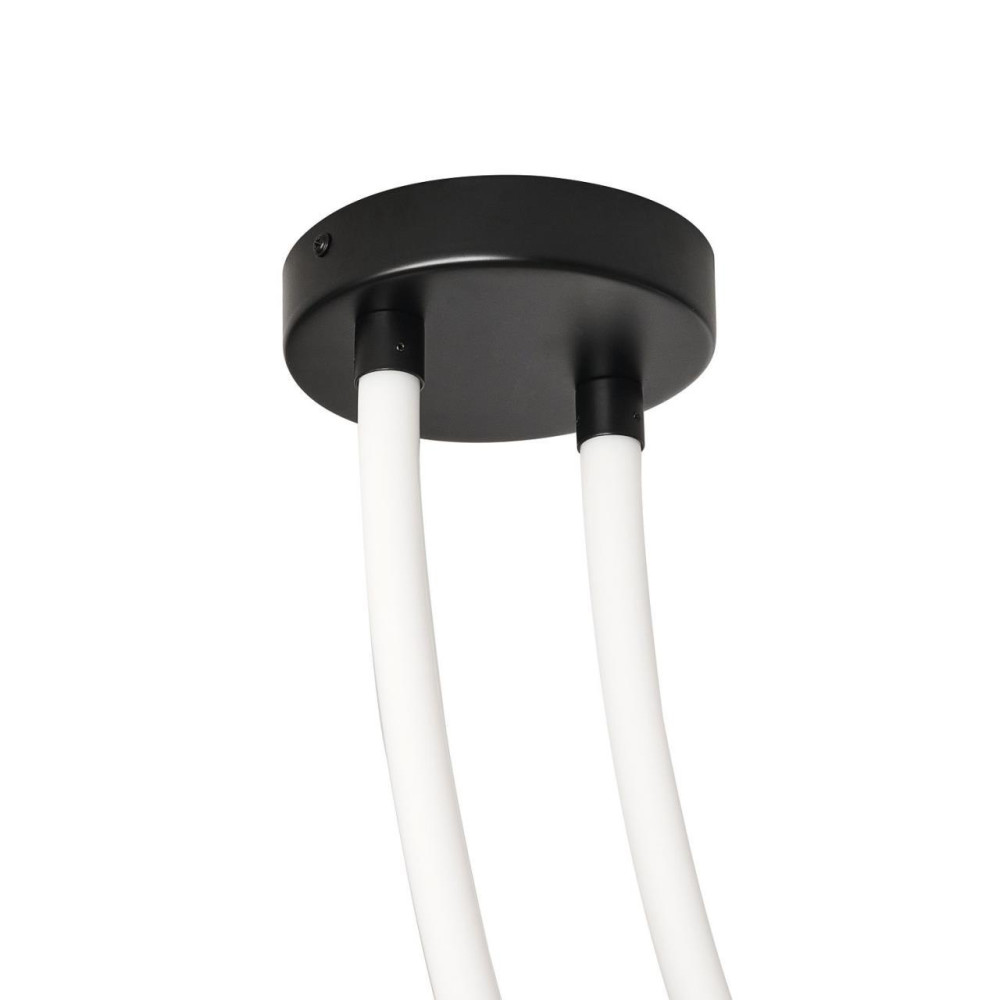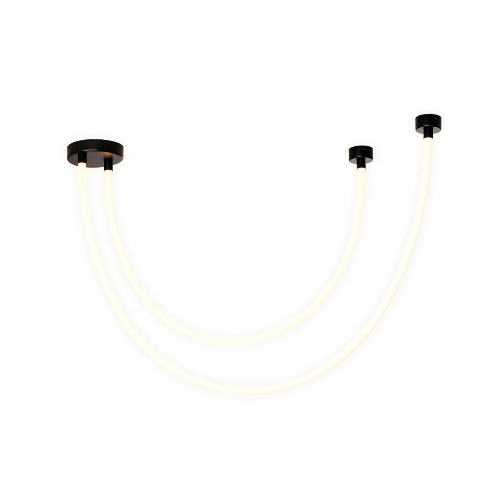 потолочный светильник, потолочное крепление из металла черного цвета, из которого выходят две длинные гибкие силиконовые трубки, выполняющие роль светового элемента, благодаря
