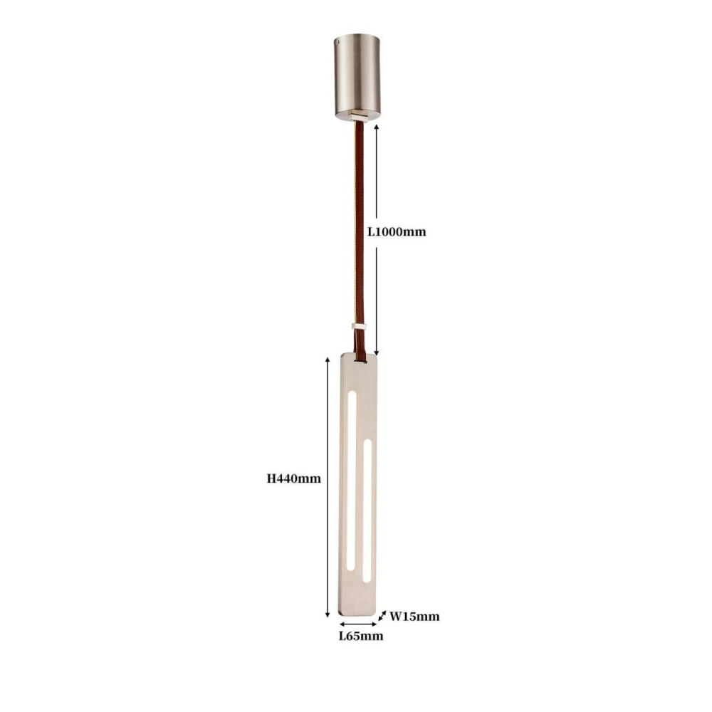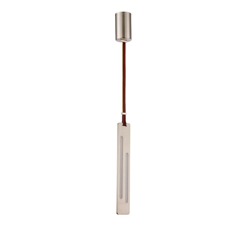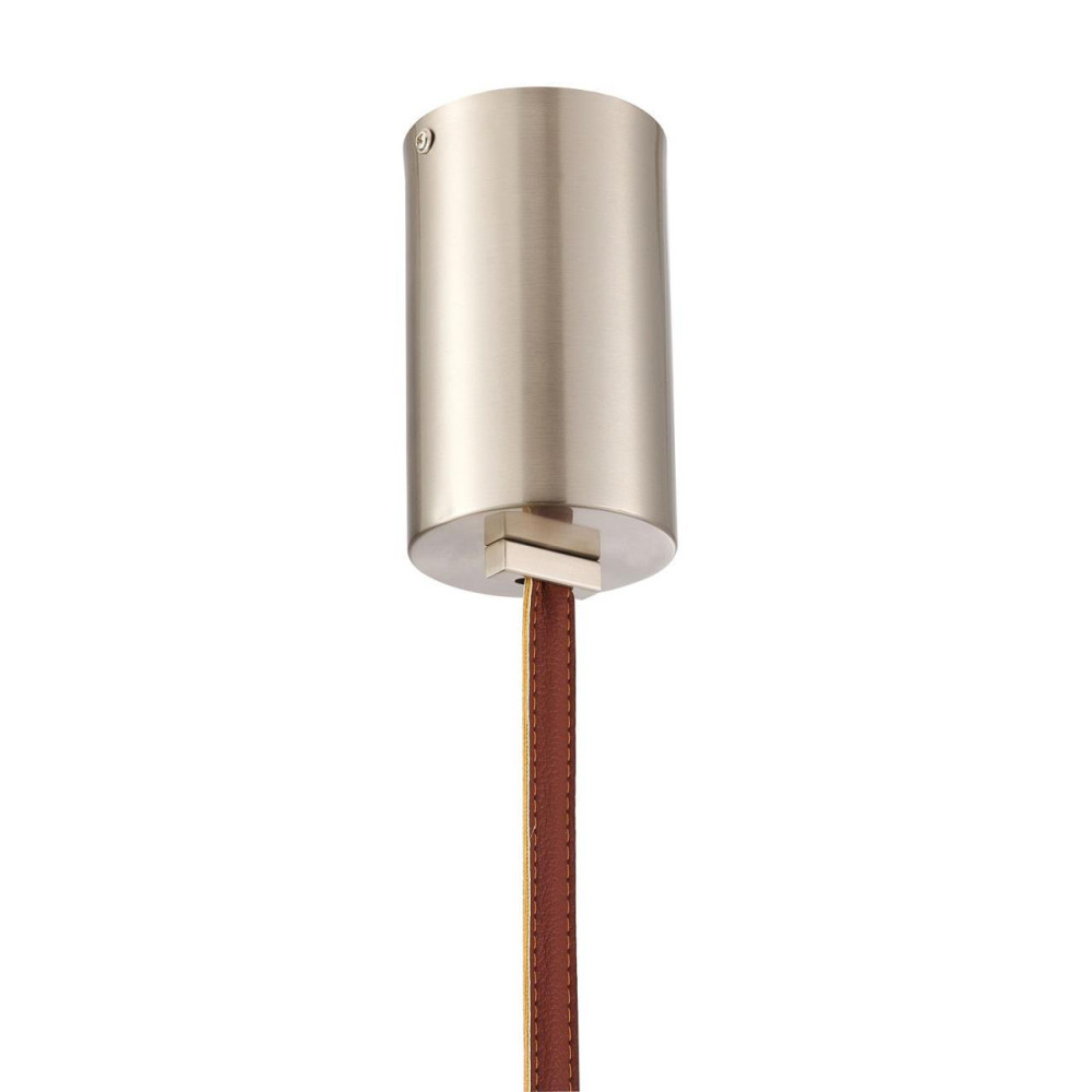 подвес, металлический плафон в цвете никель с асимметрично расположенными источниками света крепится на кожаном ремне коричневого цвета, длину которого можно регулировать