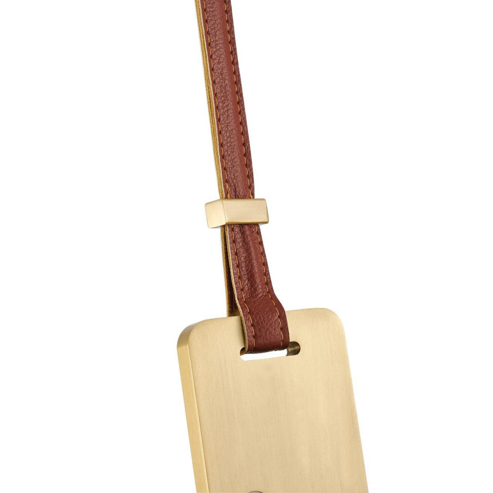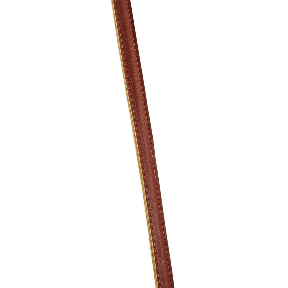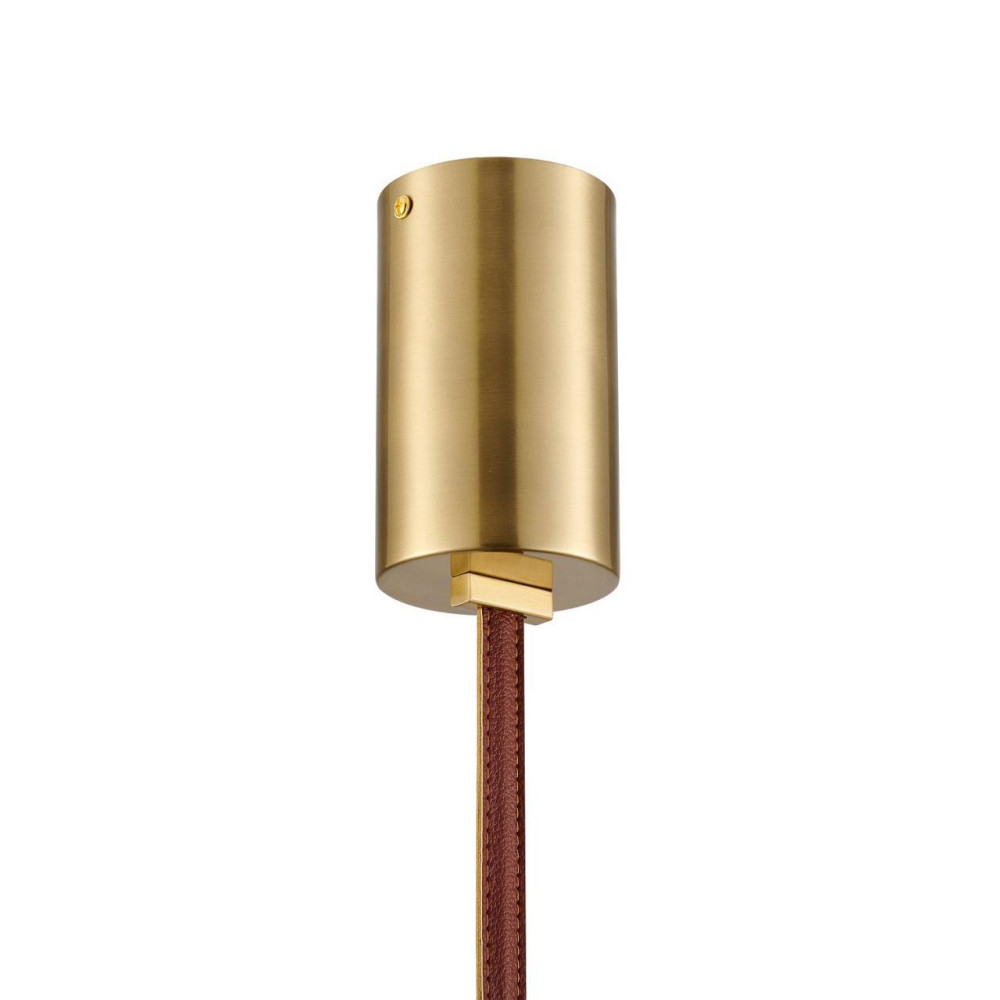 подвес, металлический плафон в цвете латунь с асимметрично расположенными источниками света крепится на кожаном ремне коричневого цвета, длину которого можно регулировать