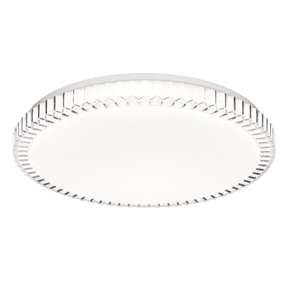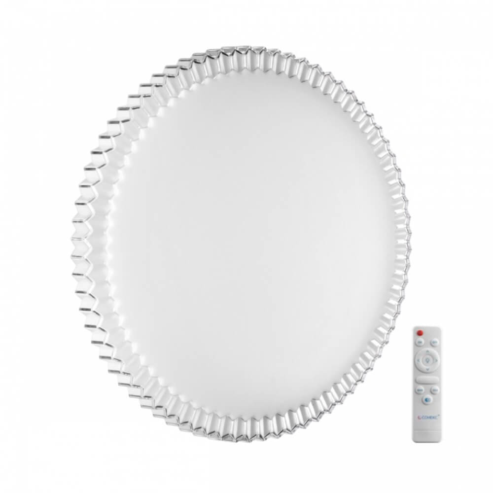 Светильник 7673/EL линии ATIKO состоит из металлического основания (базы) и пластикового рассеивателя. Материал рассеивателя - высококачественный пластик марки PMMA 2.0 белого цвета с гладкой матовой поверхностью, обеспечивающий светильнику равномерное рассеивание и хорошее светопропускание. Форма плафона: круглая, декорирована рельефным ободом из пластика прозрачного цвета. Степень защиты IP43 позволяет использовать светильник в определенных зонах влажных помещений. В комплект входит заменяемый LED модуль с линзами, мощностью 70Вт, которая соответствует лампе накаливания 610Вт. А также пульт ДУ (с креплением на стену), с помощью которого осуществляется плавное изменение цветовой температуры 3000-6000К, изменение яркости, переход в режим переключения теплого/белого/холодного/ночного света. Светильник имеет функцию "память"