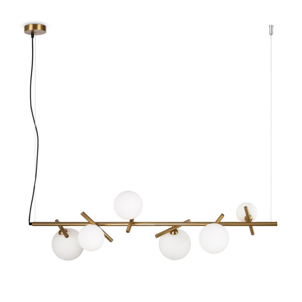 Материал арматуры — рифленый металл, цвет — латунь. Плафоны-сферы из белого матового стекла для мягкого заливающего света. Воздушный образ плафонов, строгие тонкие линии арматуры придадут интерьеру изящество и легкость. Высота подвесов регулируется. Источник света — лампы с цоколем G9