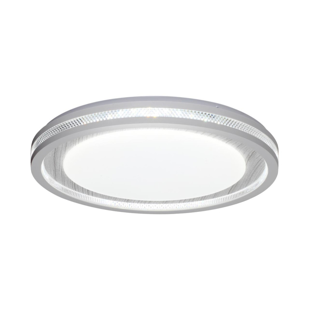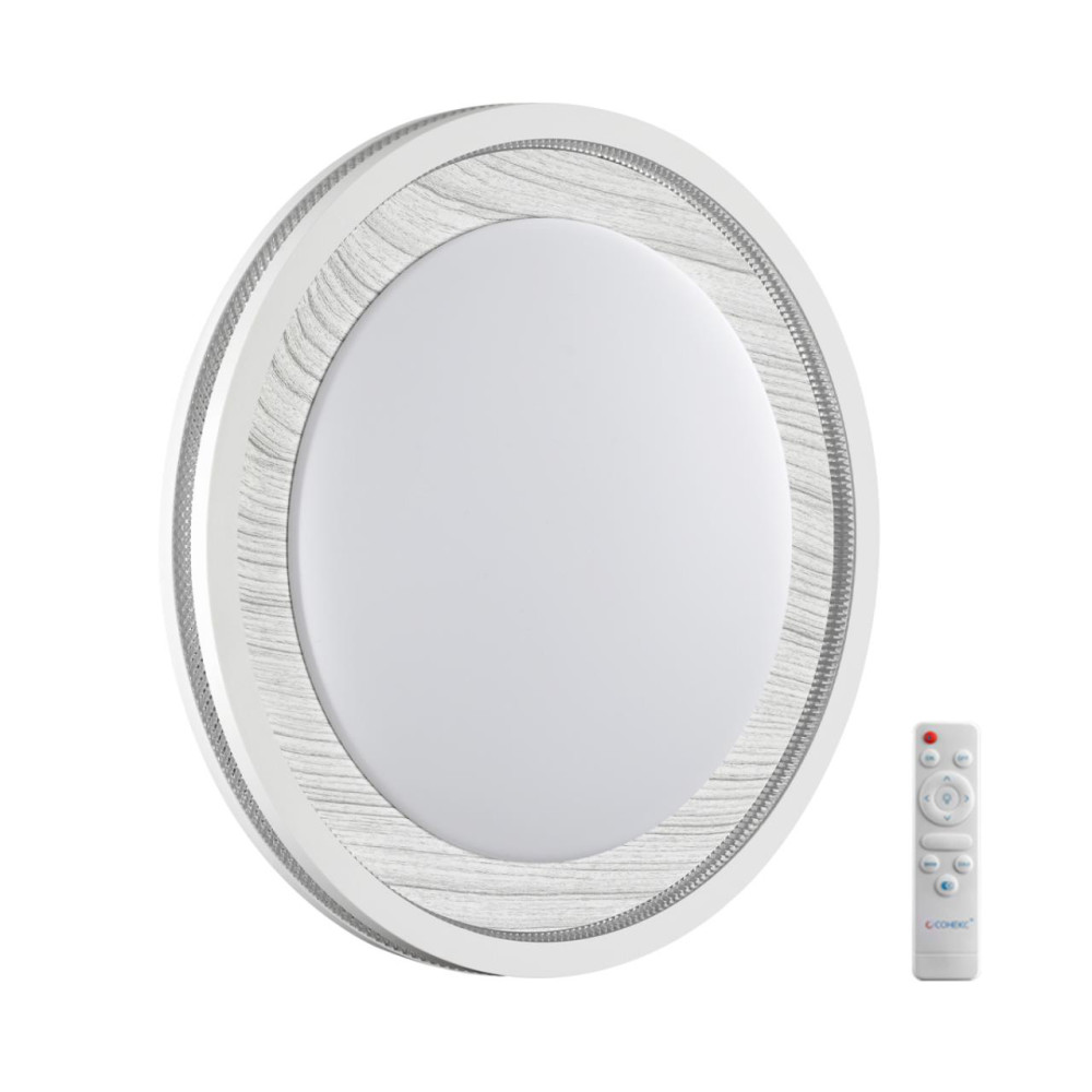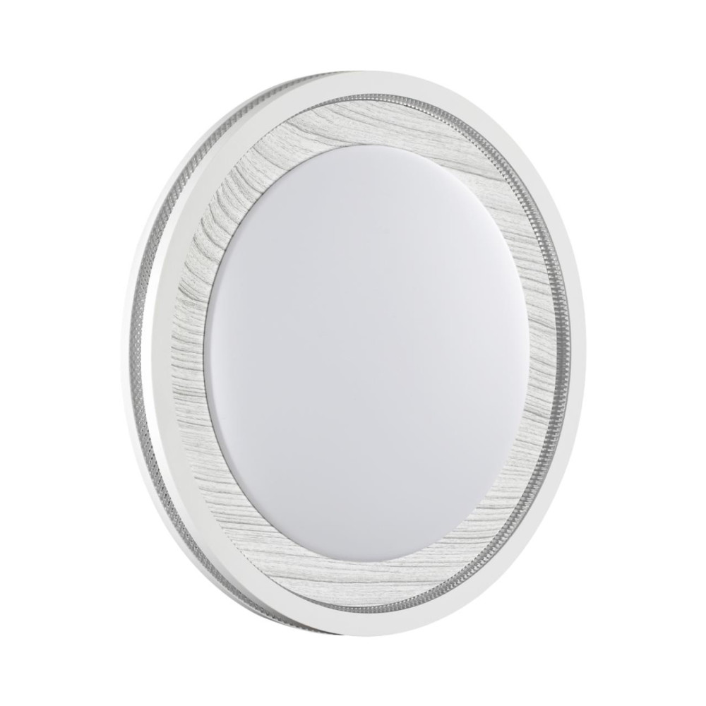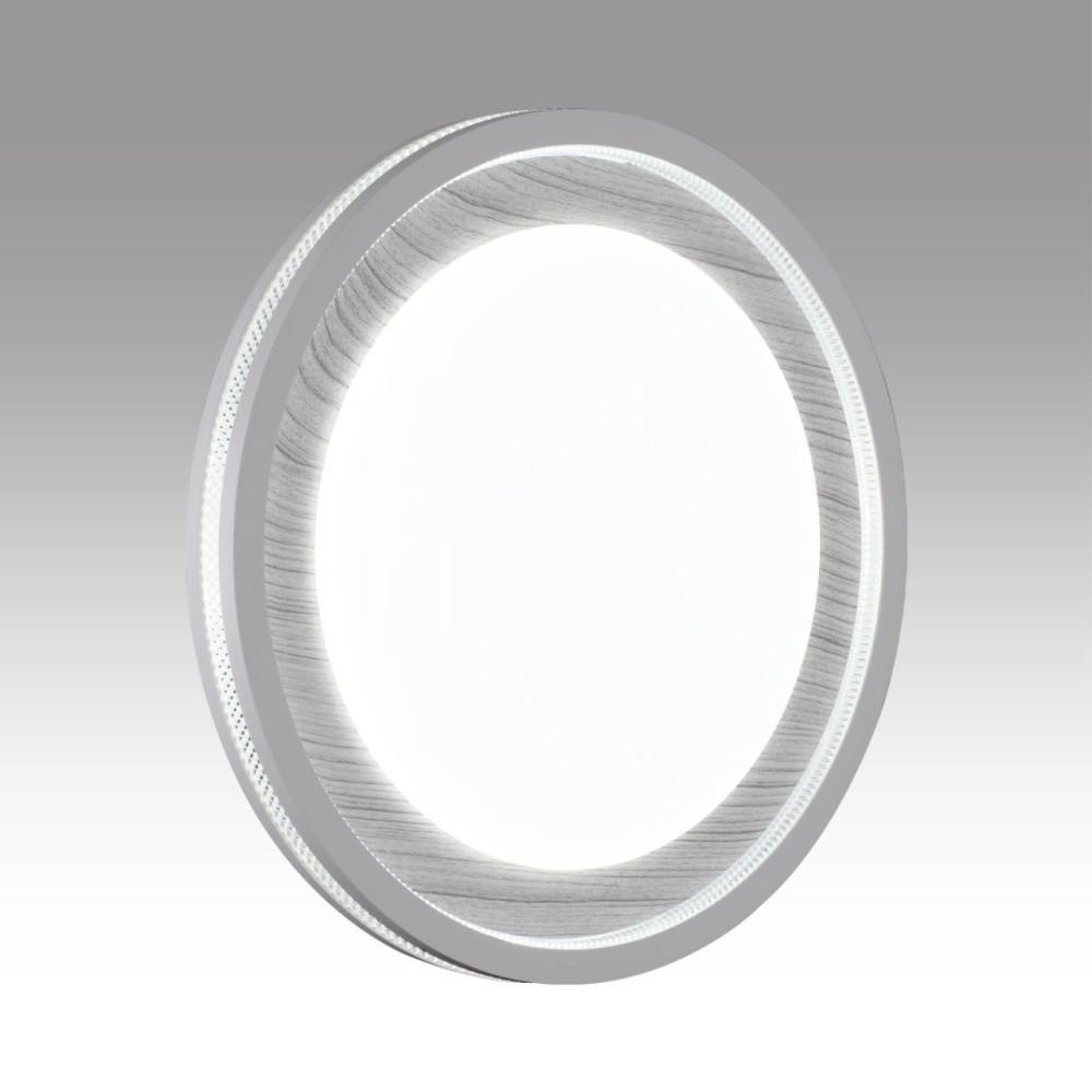 Светильник 7681/EL линии MAVI WOOD состоит из металлического основания (базы) и пластикового рассеивателя. Материал рассеивателя - высококачественный пластик марки PMMA 2.0 белого цвета с матовой поверхностью, без текстуры. Пластик обеспечивает светильнику равномерное рассеивание и хорошее светопропускание. Форма плафона: круглая, декорирована ободом из пластика светло-серого цвета "под дерево" с прозрачной вставкой "под хрусталь". Степень защиты IP43 позволяет использовать светильник в определенных зонах влажных помещений. В комплект входит заменяемый LED модуль с линзами, мощностью 70Вт, которая соответствует лампе накаливания 610Вт. А также пульт ДУ (с креплением на стену), с помощью которого осуществляется плавное изменение цветовой температуры 3000-6000К, изменение яркости, переход в режим переключения теплого/белого/холодного/ночного света. Светильник имеет функцию "память"