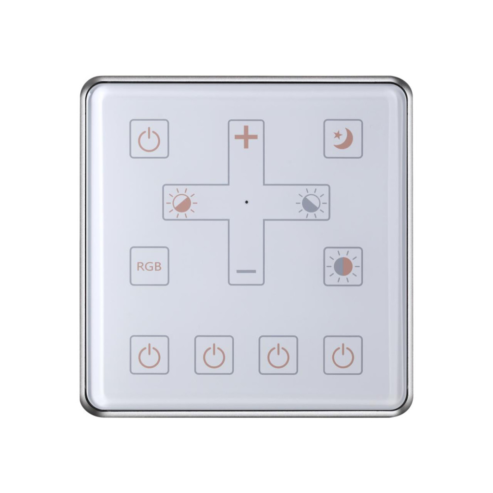 Настенная панель позволяет задавать до четырёх групп освещения, изменять яркость и цветовую температуру светильников на модульной системе GLAT
