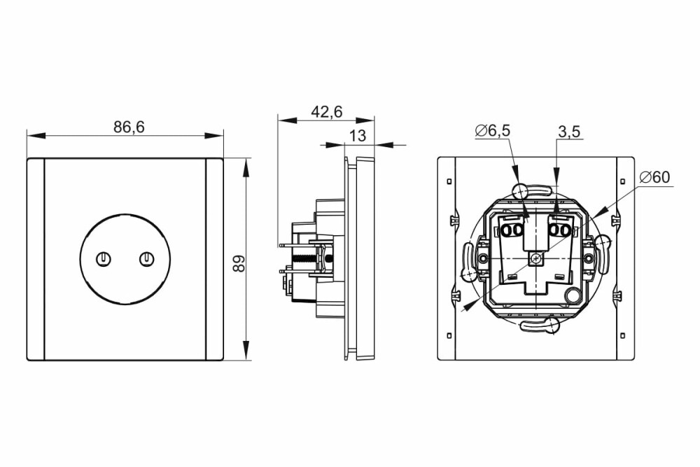 Розетка предназначена для скрытой установки внутри помещений, устанавливается в стандартные монтажные коробки с диаметром оси крепежных винтов - 60 мм, глубиной 40 мм.