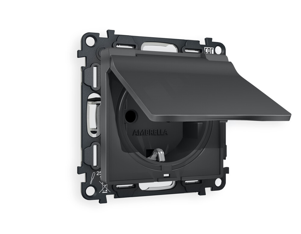 Комплект механизма электрической розетки ALFA MA908010 Графит мягкое касание с заземлением с шторками и защитной крышкой 2P+E 16A-250V IP44 QUANT